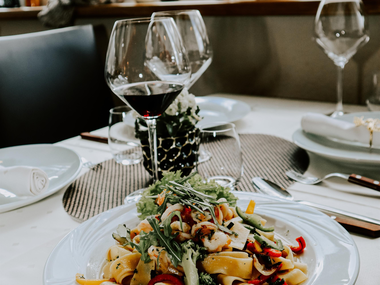 Genieße frisch zubereitete Pizza aus dem Steinofen, hausgemachte Pasta, saftige Steaks und mediterrane Spezialitäten inmitten der Alpen am Fuße des Muttersbergs.